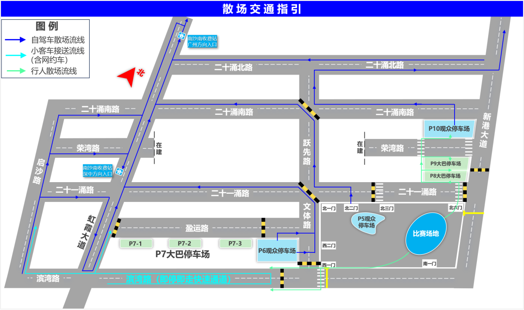 建议由南沙南收费站下高速,经启沙路出虹霞大道后前往P5、P6停车场停放,或由新龙收费站下高速,经新港大道、二十涌南路前往P10停车场停放后,沿行人通道前往比赛场地。